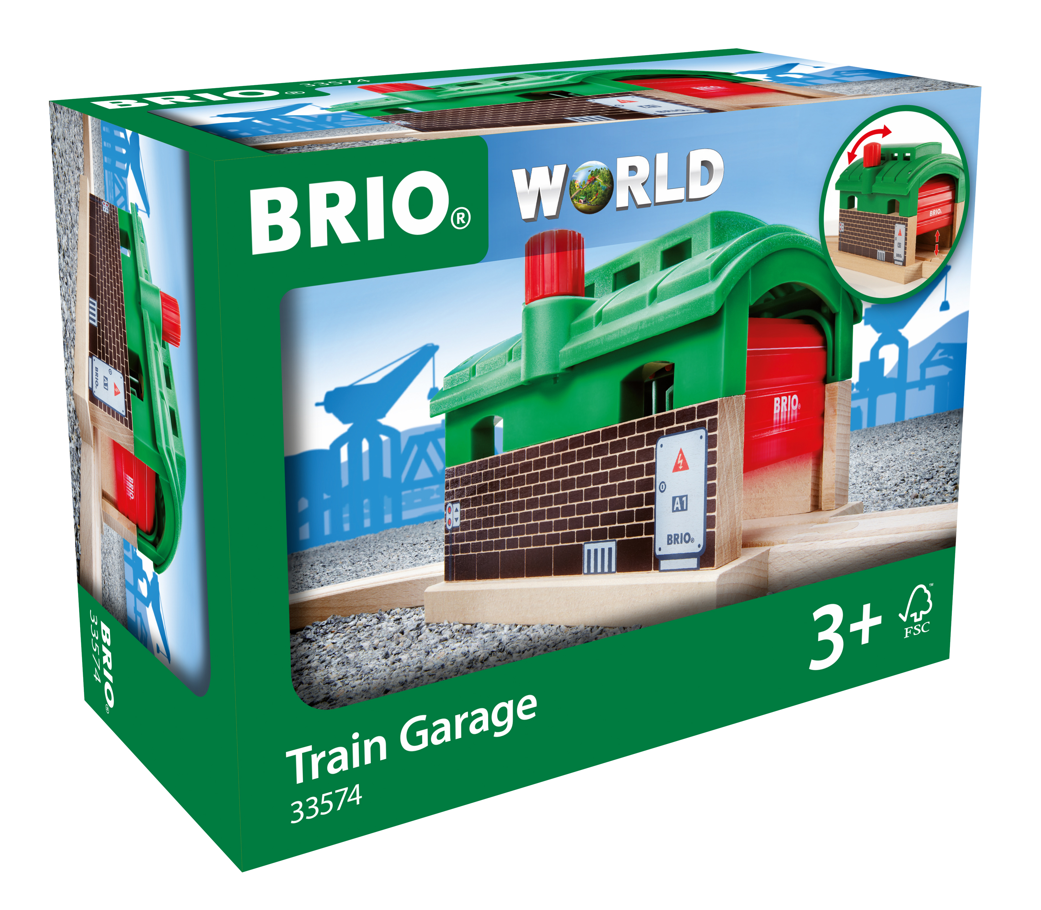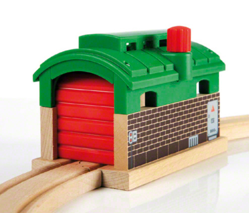 En lille tog garage fra Brio, der passer lige ned over dine Brio jernbaneskinner. Legetøjsgaragens porte åbnes ved, at man med håndkraft drejer på en lille knap, på toppen af toggaragen.