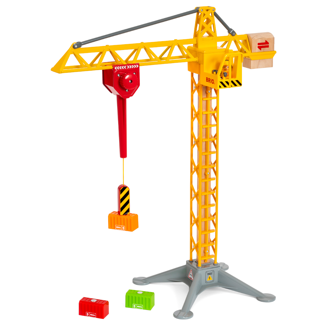 Stor flot kran fra legetøjsmærket Brio. Kranen er fantastisk tilføjelse til din Brio togbane, og er med til at give endnu flere timers leg. Byggekran er næsten en halv meter høj, med lys, 360 grader roterende tårn, magnetkrog og arbejdsvogn