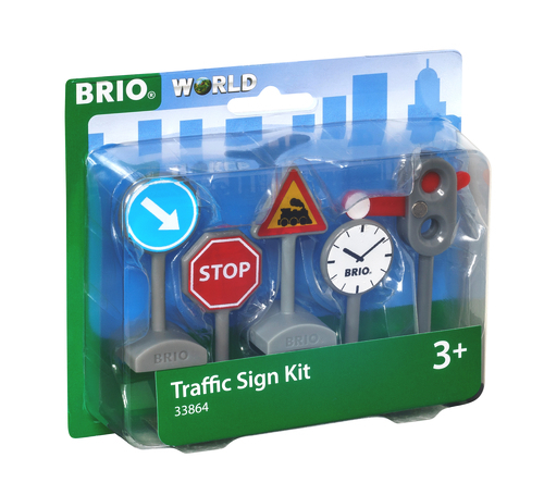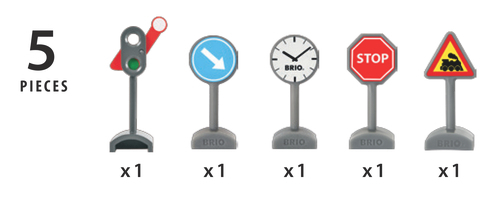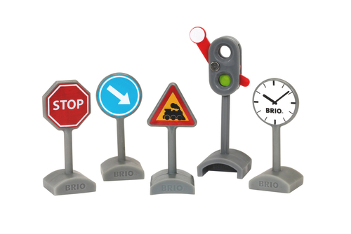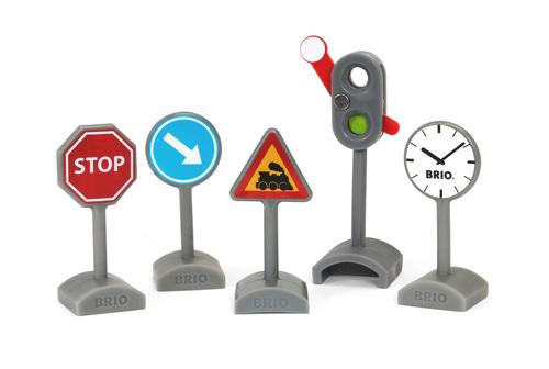 Brio har lavet denne fine pakke med trafik skilte. Der er hele fem forskellige skilte, der kan gøre det endnu sjovere at lege med din Brio togbane.