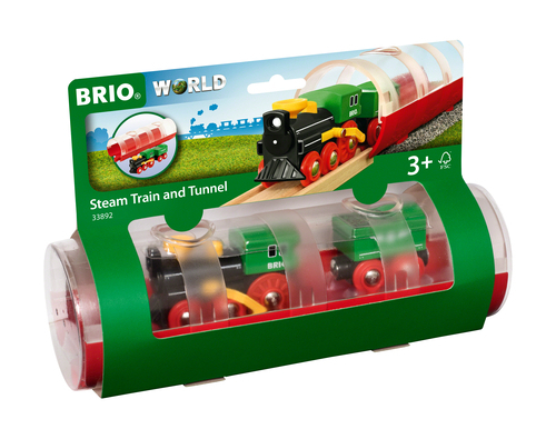 Fra legetøjs universet Brio World kommer dette damptog med tunnel. Denne model hedder steam train and tunnel, og indeholder en tunnel, der kan sættes på dit Brio skinnesæt, og et damplokomotiv med vogn. Brio World legetøjet anbefales til børn fra 3 års alderen