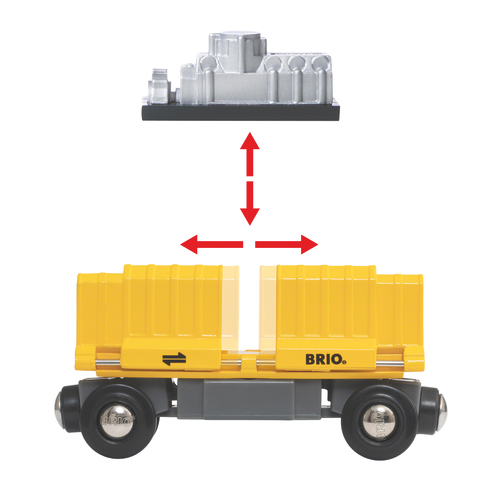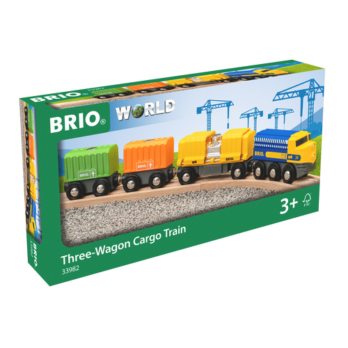 Denne pakke fra svenske Brio, er et Godstog med tre vogne. Pakken hedder Three-wagon Cargo train og indeholder 7 dele, nemlig 1 tog, tre vogne, 2 containere og 1 motor. Legetøjet er fremstillet i solid europæisk bøgetræ, hårdfør plastik. Legetæget anbvefaldes til børn fra 3+