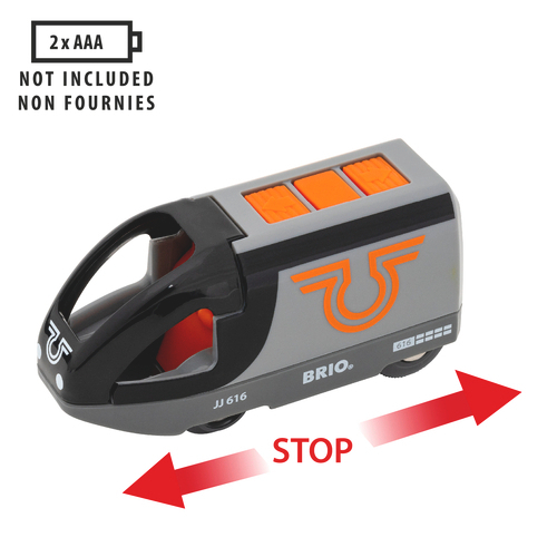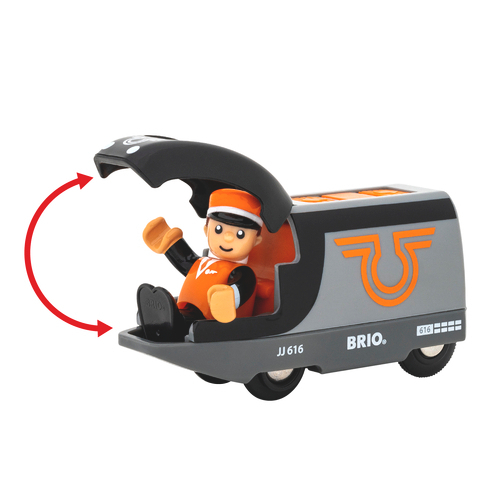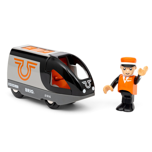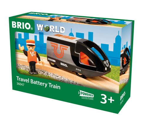 Travel battery train er en batteridrevet lokomotiv i sort og orange fra Brio world serien. Lokomotivet styres let via knapper på taget. Dette fine lokomotiv kan køre både forlæns og baglæns, og har plads til lokoføren forrest. Der medfølger ikke batterier