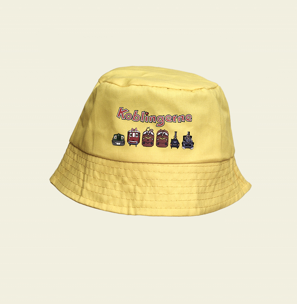 Dette er den fineste bøllehat med koblingerne motiv på i 100 bomuld. Denne udgave af den søde børnehat er gul og måler 13 cm i toppen og 21 cm bunden