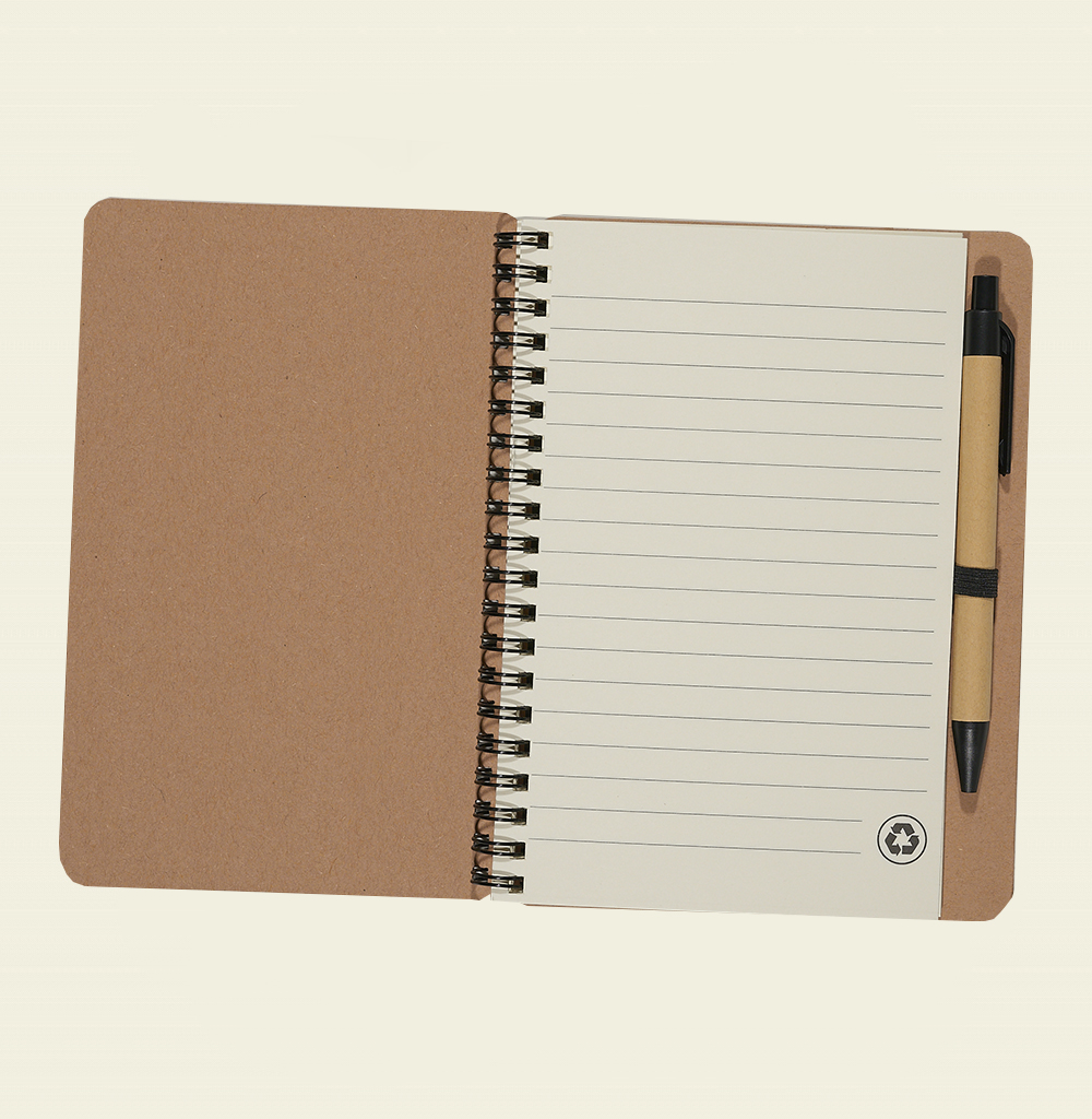 Fin lille notesbog med spiralryg og medfølgende kuglepen. Notesbogen er lavet i genanvendt papir og har målene 17,5 cm x 14 cm.