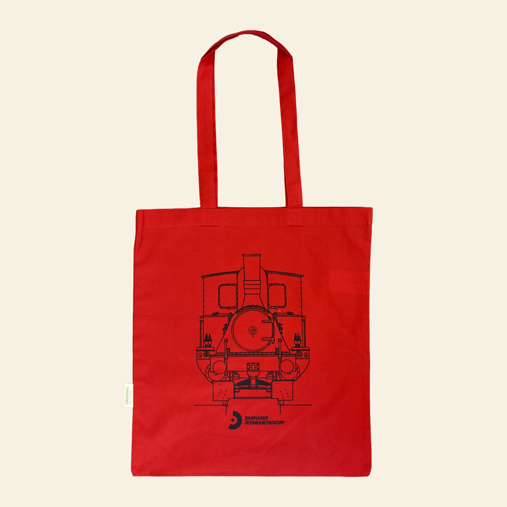Vi har fået lavet endnu en super flot mulepose i økologisk bomuld. Denne gang i den fineste røde farve med en stregtegning af O-lokomotivet på fronten